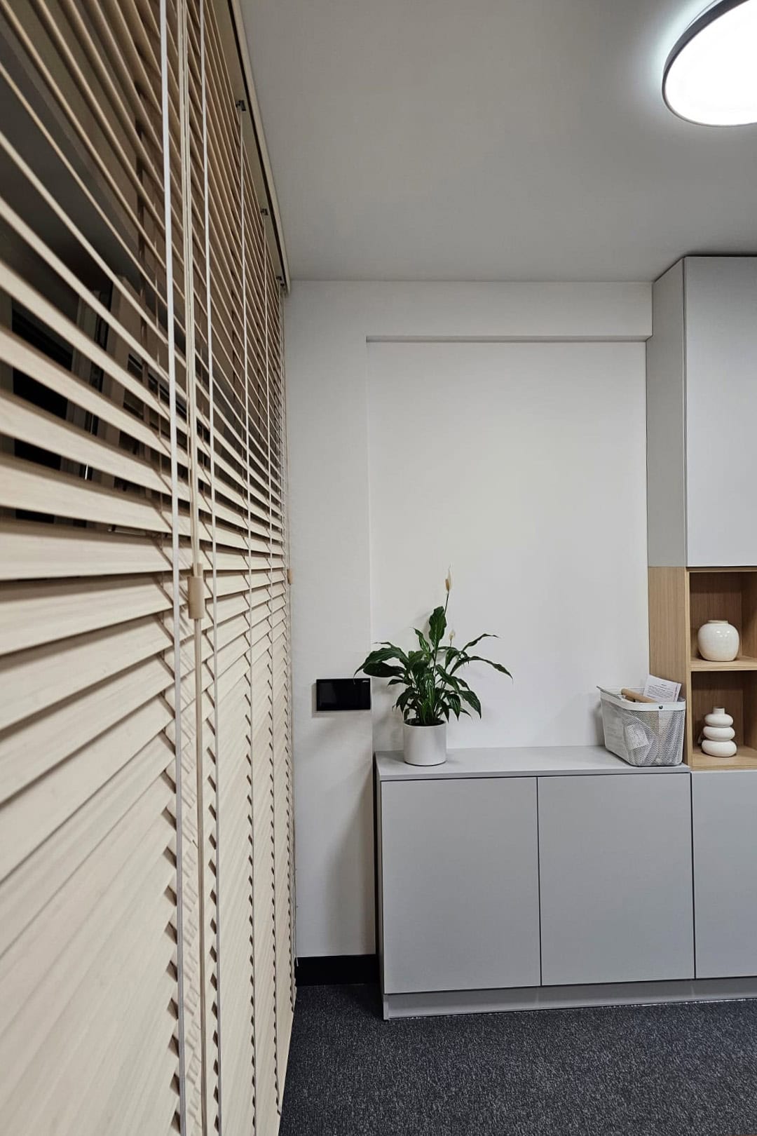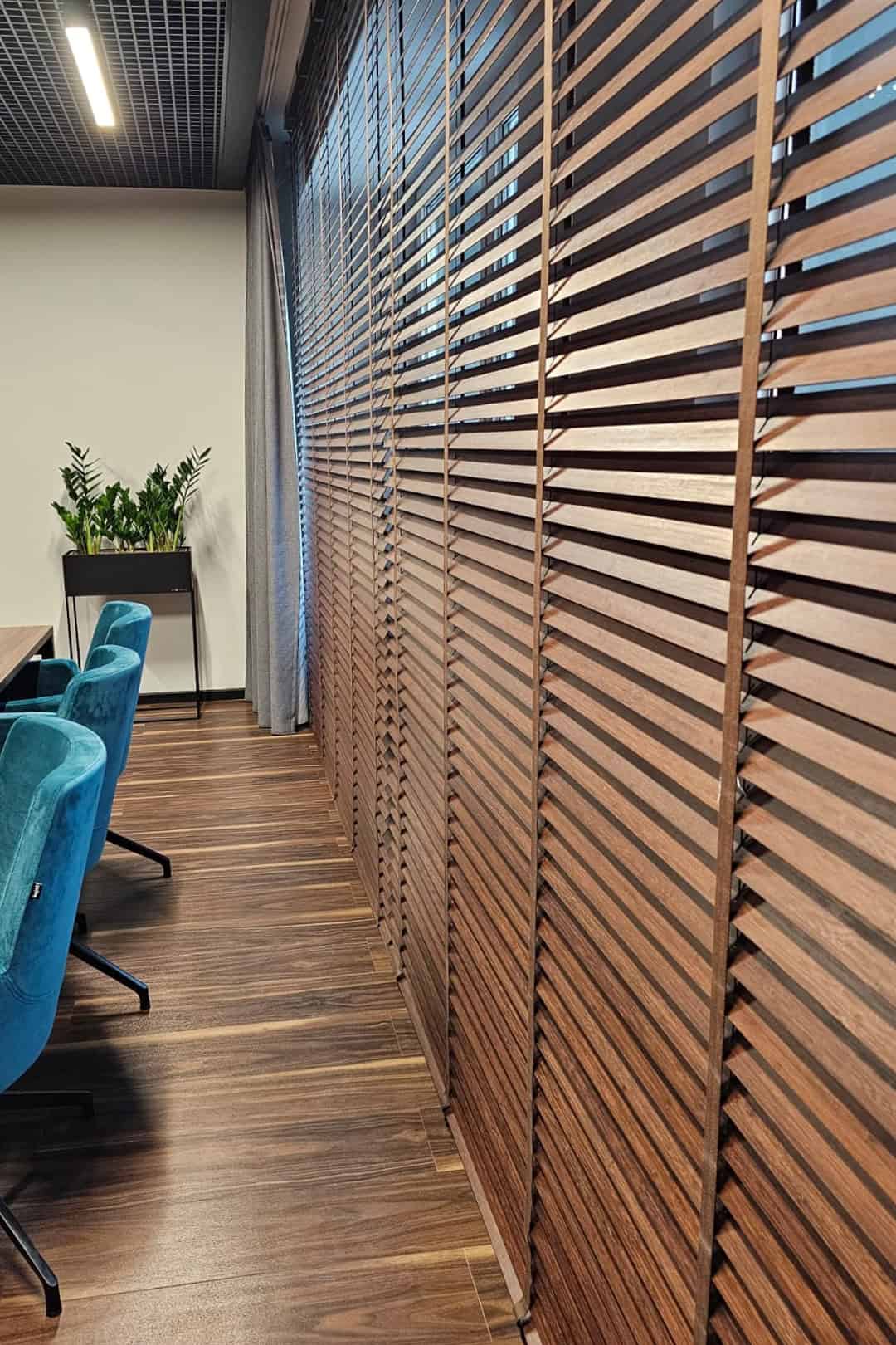 Żaluzje drewniane z Pracowni z Duszą świetnie prezentują się w powierzchniach biurowych oraz w domach. Są wykonane z drewna egzotycznego, zatem sprawdzą się także w pomieszczeniach wilgotnych (łazienki, kuchnie itp.)